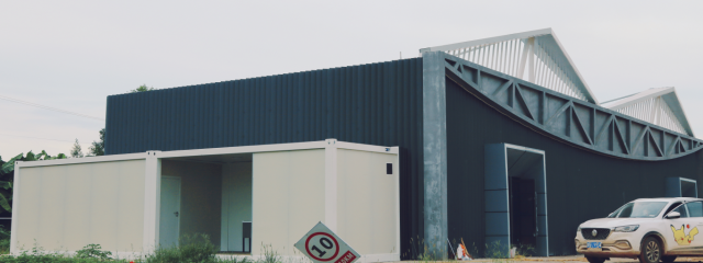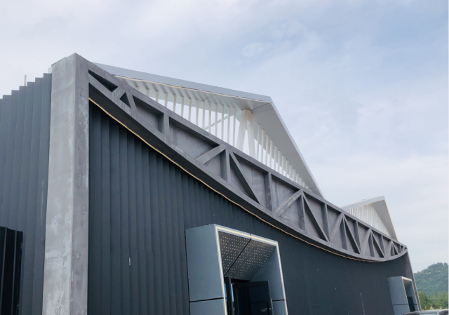 The exterior of the exhibition hall resembles a bridge, with walls finished in a combination of metal and cement-based coatings. This design echoes the project’s specialized construction techniques and materials—specifically the “island construction and concrete interlocking piles”—thereby contributing to the protection of the Jialing River’s drinking water sources and rare fish species.