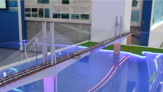 At the end of the bridge stands a bridge-shaped digital exhibition hall we constructed, featuring project overviews, VR displays, a digital sand table, an information command center, construction technology deployment areas, and meeting rooms. Additionally, essential restroom facilities have been specially added adjacent to the exhibition hall…